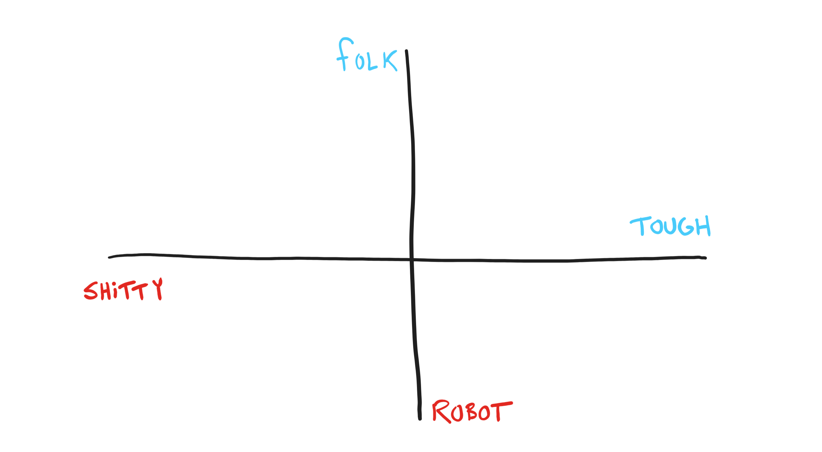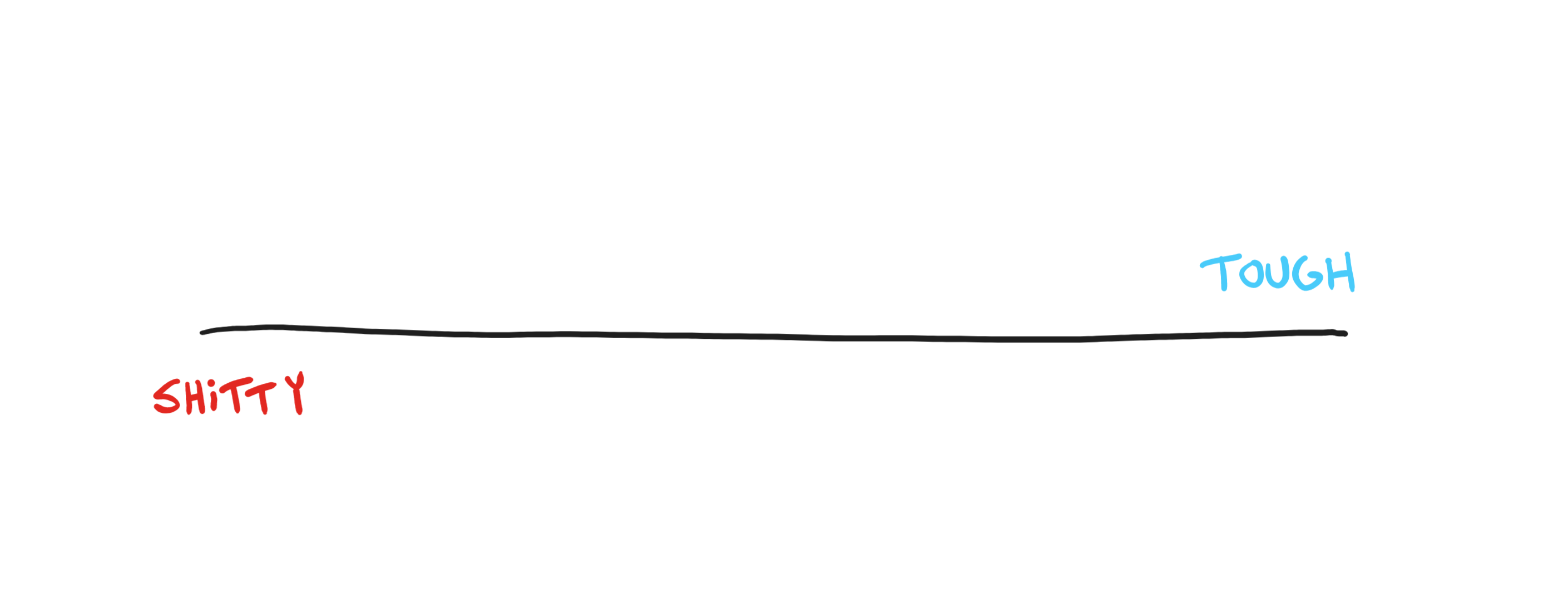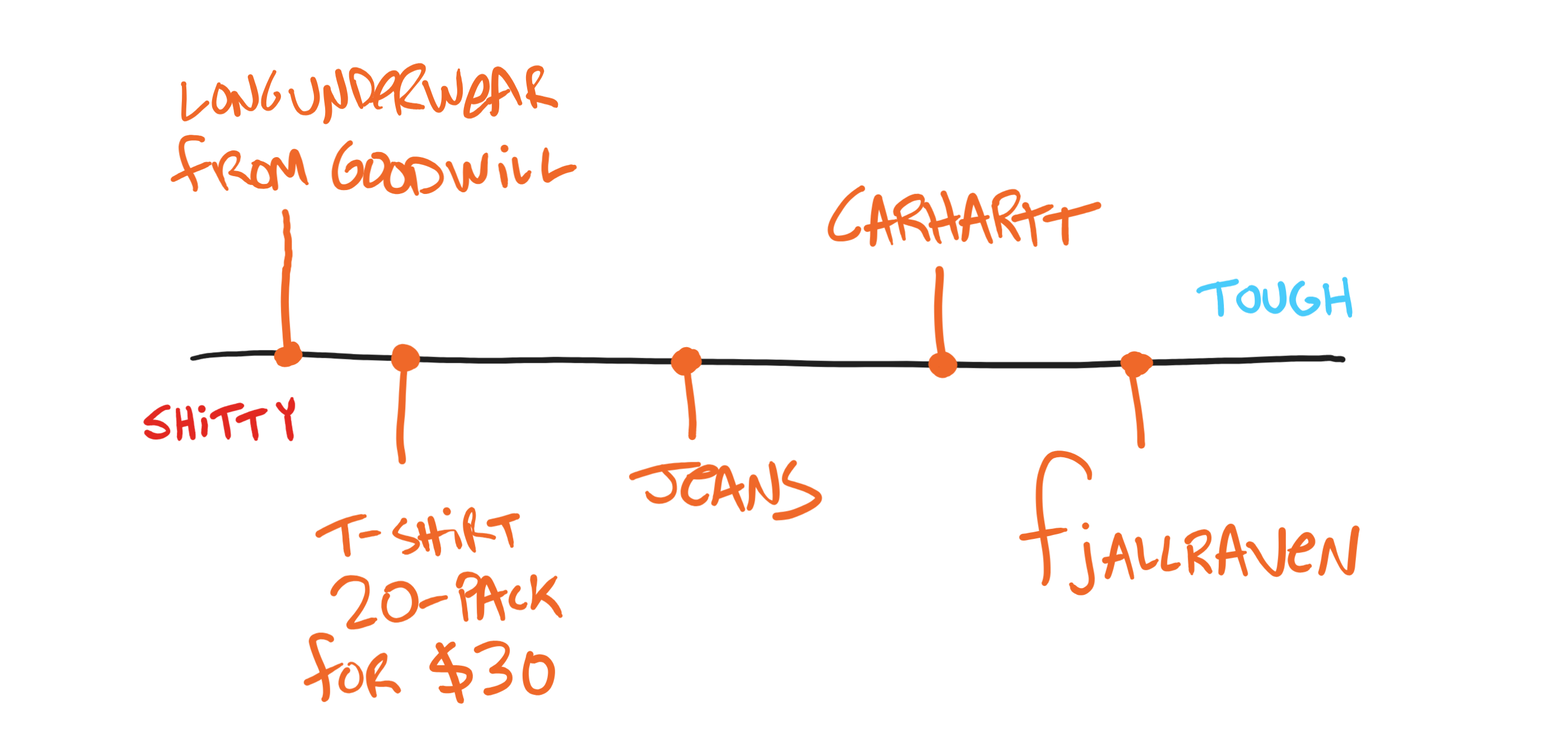 The first dimension is from Shitty to Tough. Some clothes last a lifetime, and others deteriorate very quickly. The following examples are from my personal experience.