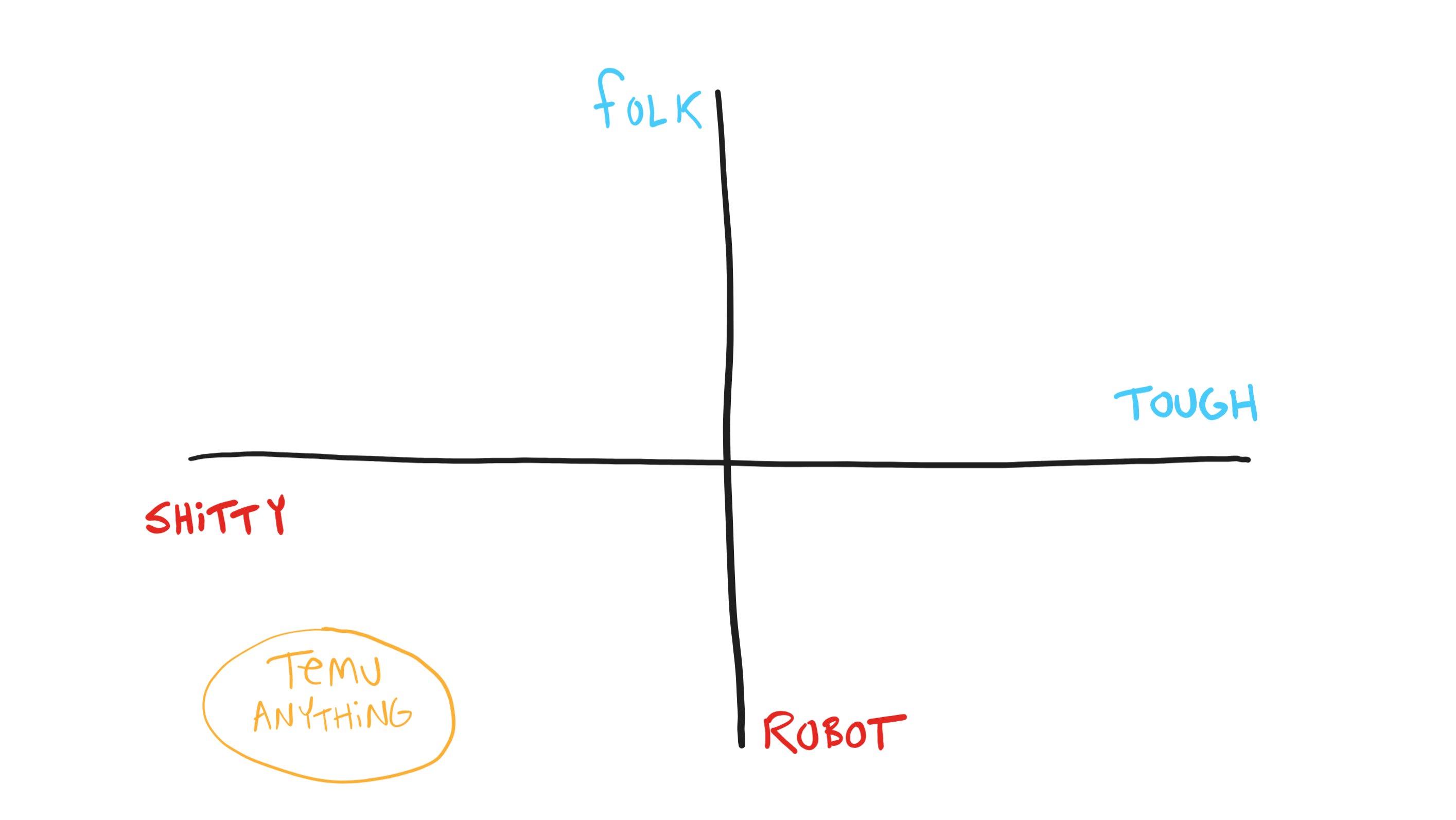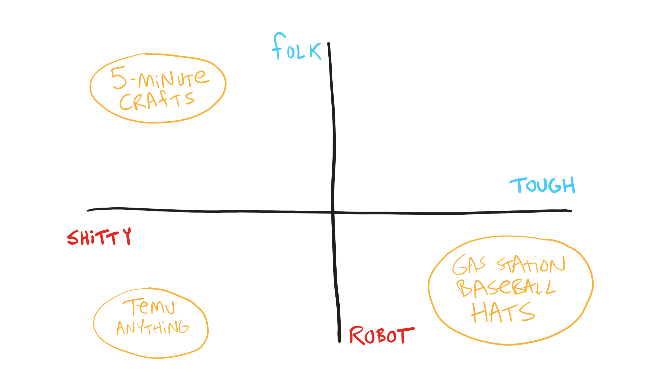 In the Folk/Shitty quadrant, we will find anything that is both accessible and stupid. I have a real fire burning against these kinds of things. Macaroni art, plastic beads, glue slime, pipe cleaners, popsicle sticks. Burn it all and cover the ashes with rocks so the dogs can't dig it up. Some people will make the case that high-quality materials are not accessible to everyone, or that not everyone has a high-enough level of skill to make really "nice" objects. This is a a trick and a lie.