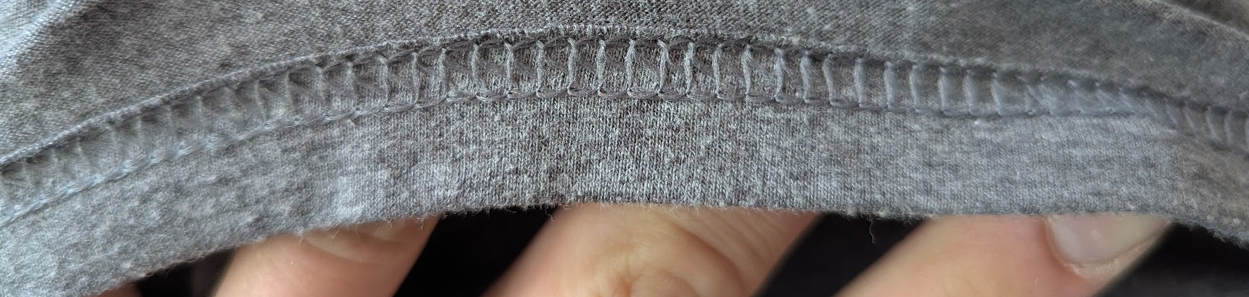 The long underwear, in particular, had that horrible loose overlock stitch so common in cheap-ass clothing (pictured below). The overlock stitch is fast and cheap, but truly a wretched way to hold fabric together.