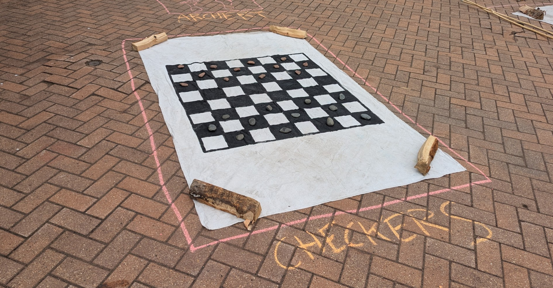 Anyone coulda painted squares on a sheet and found some rocks, and y'know what, that works just fine.
