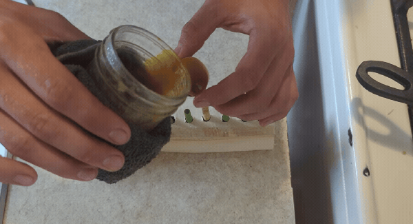 A much cleaner pour! The finely-ground charcoal and nicely-melted beeswax make a fine combination. I did notice that many of the horsetails actually leaked out the bottom, but just like the funnel, the hole plugged quickly with hardening wax.