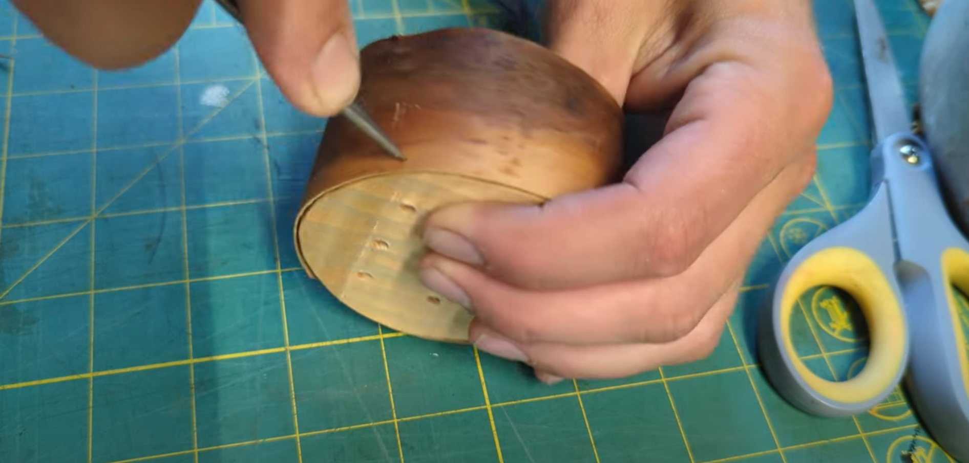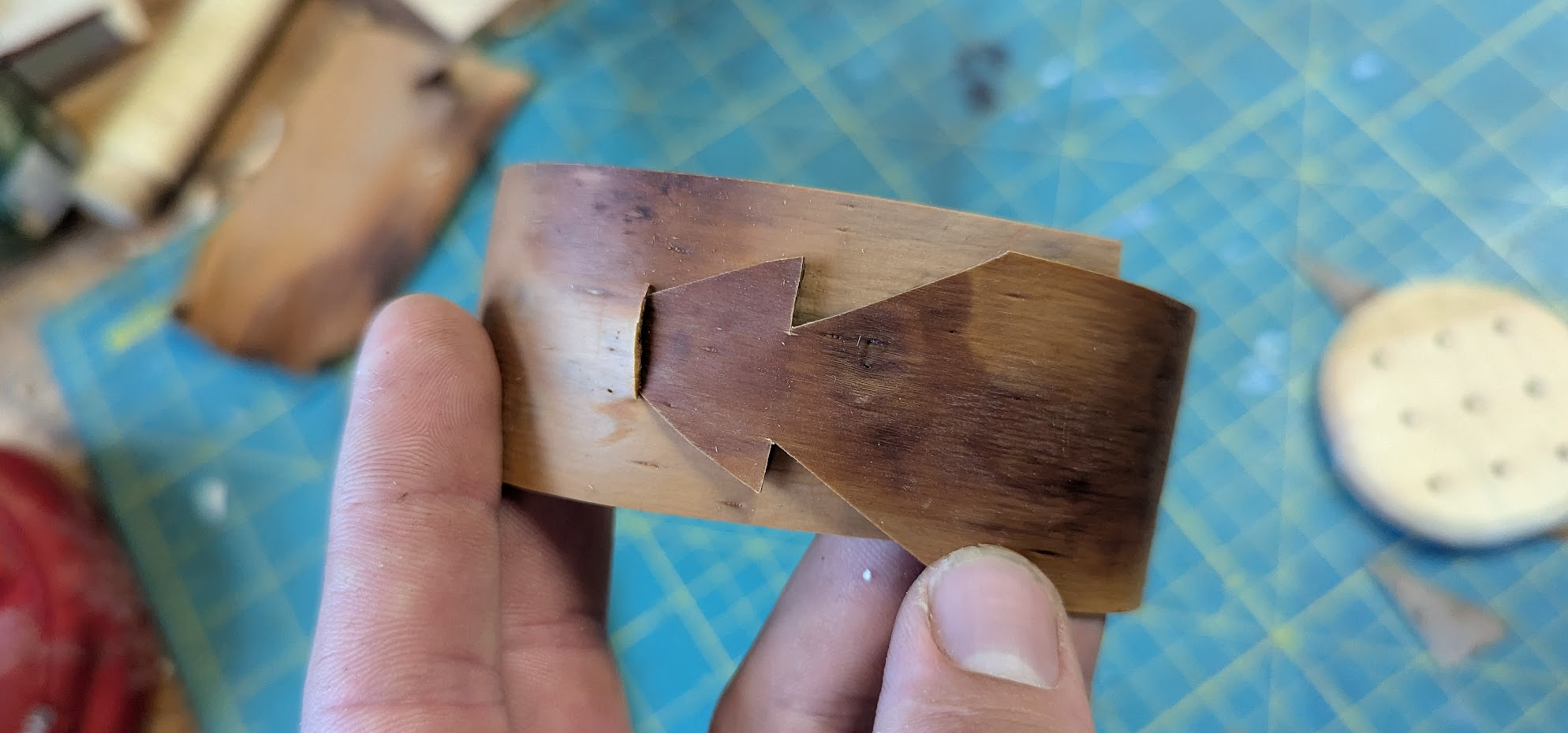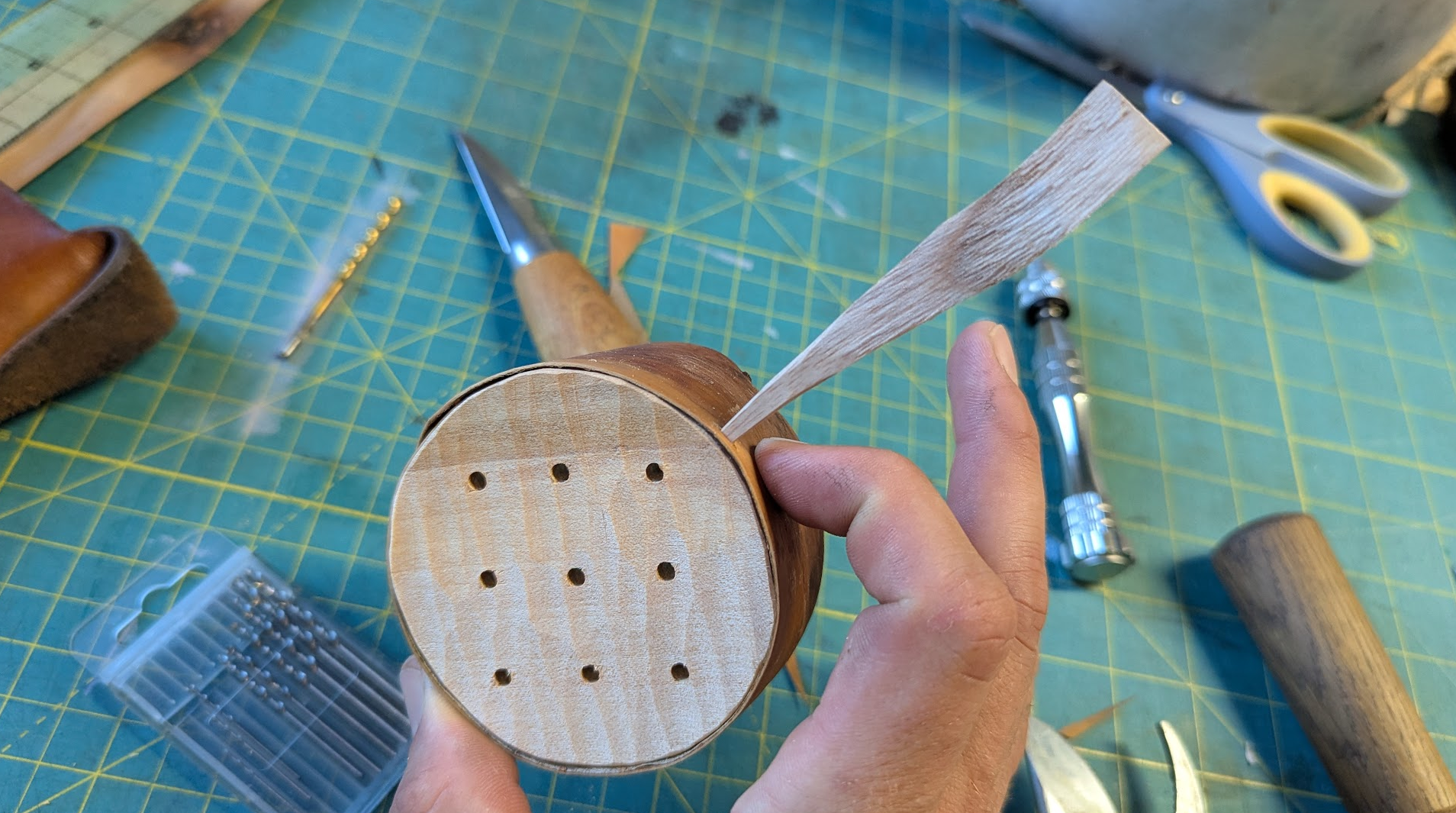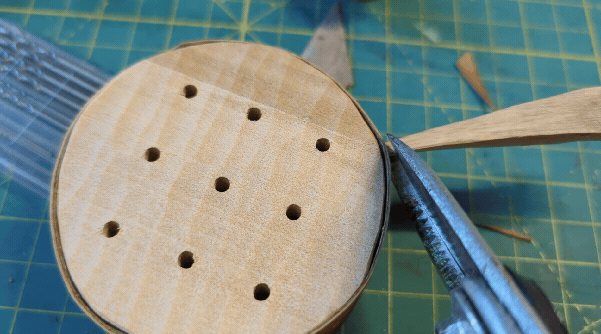 To fasten the bark to the wooden top, you poke a little hole...
