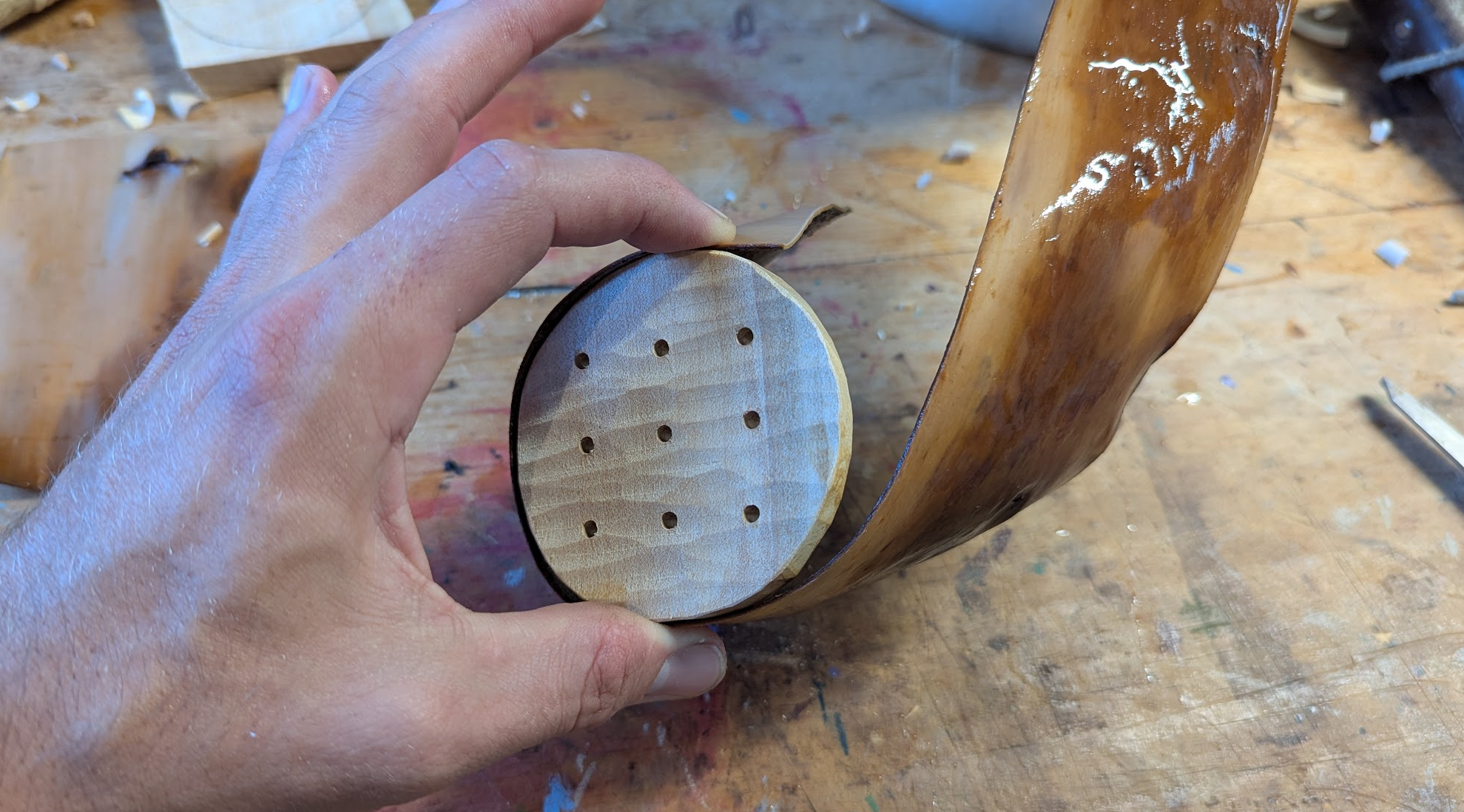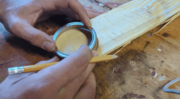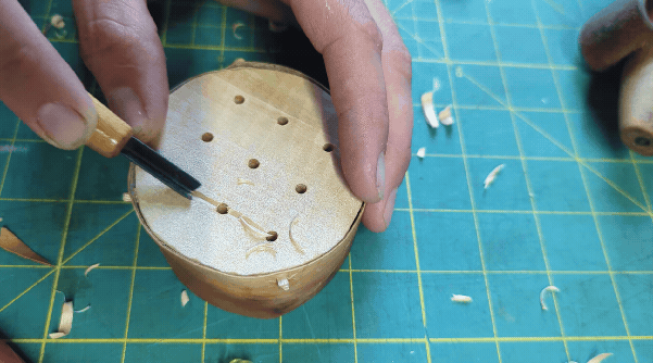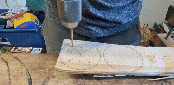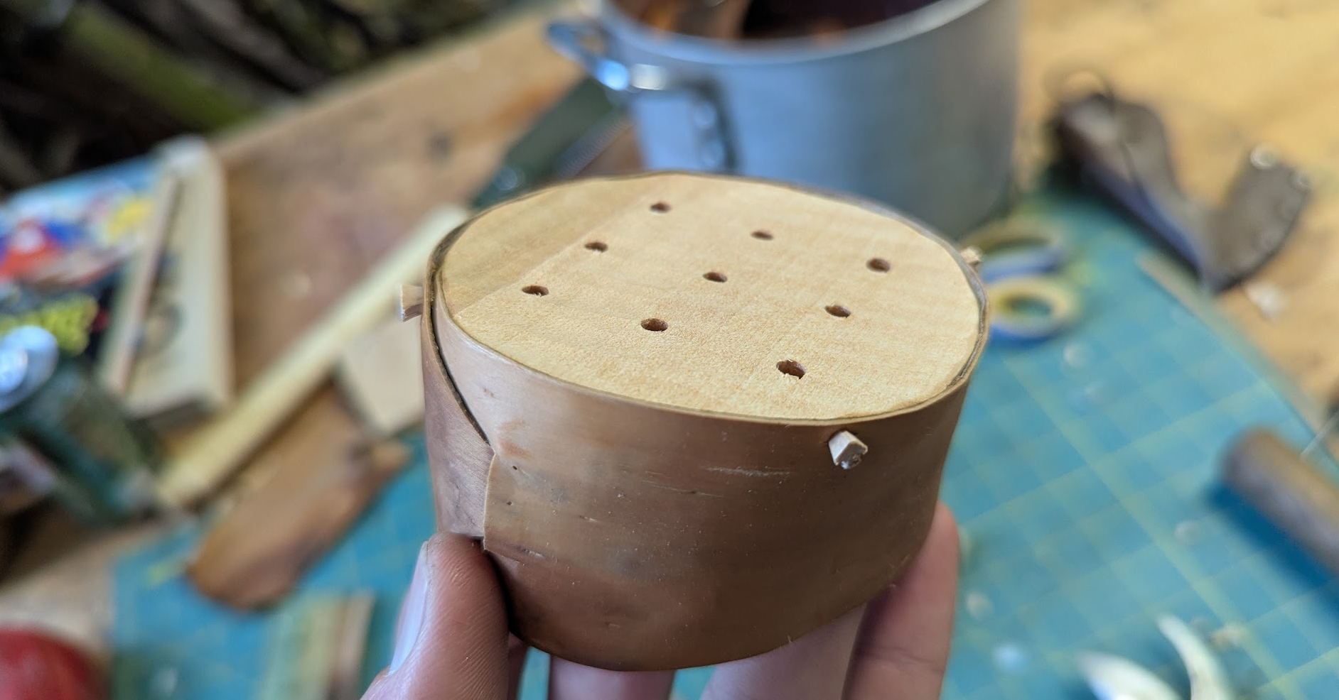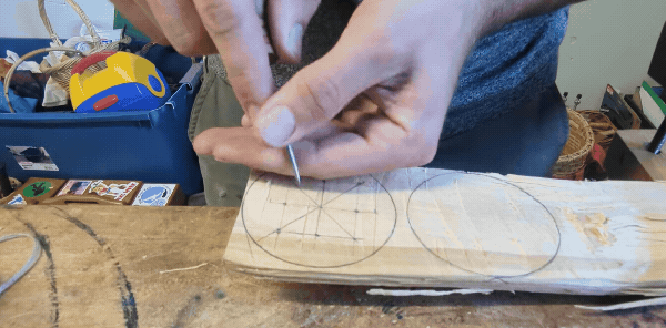 To fasten the bark to the wooden top, you poke a little hole...