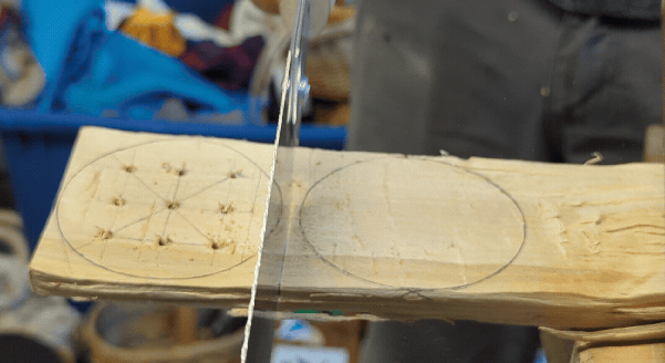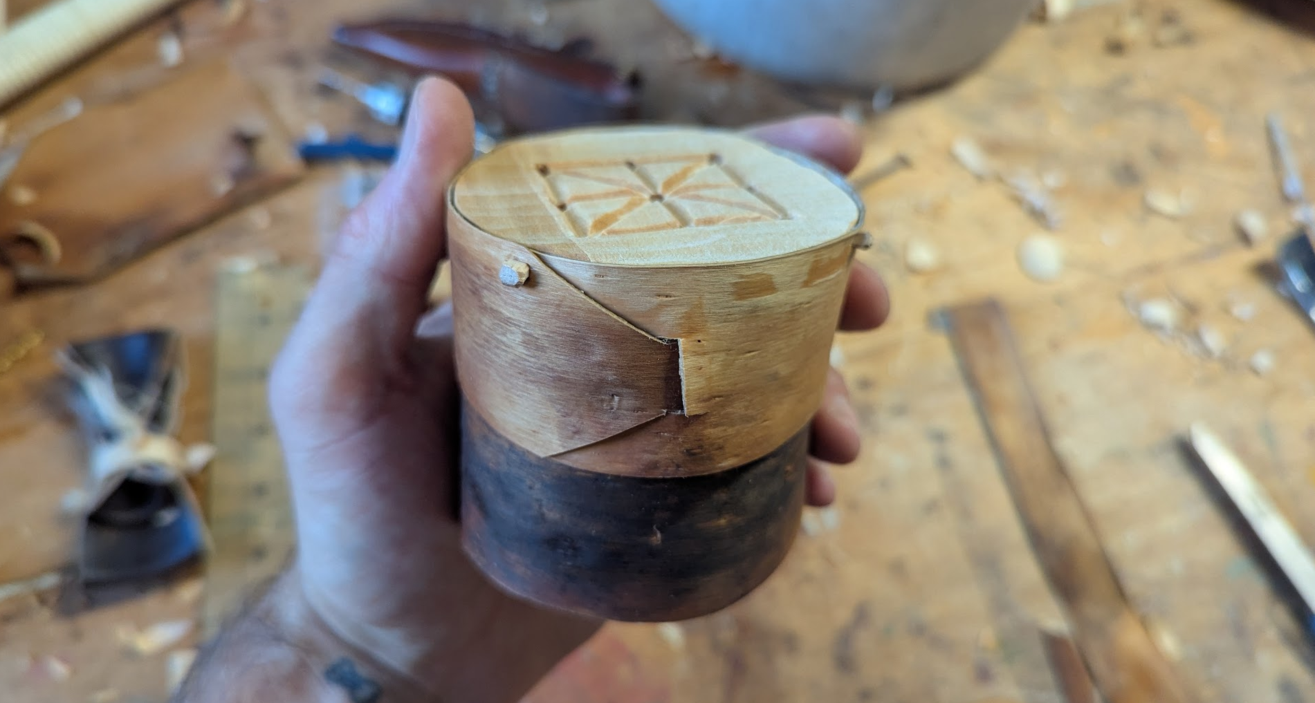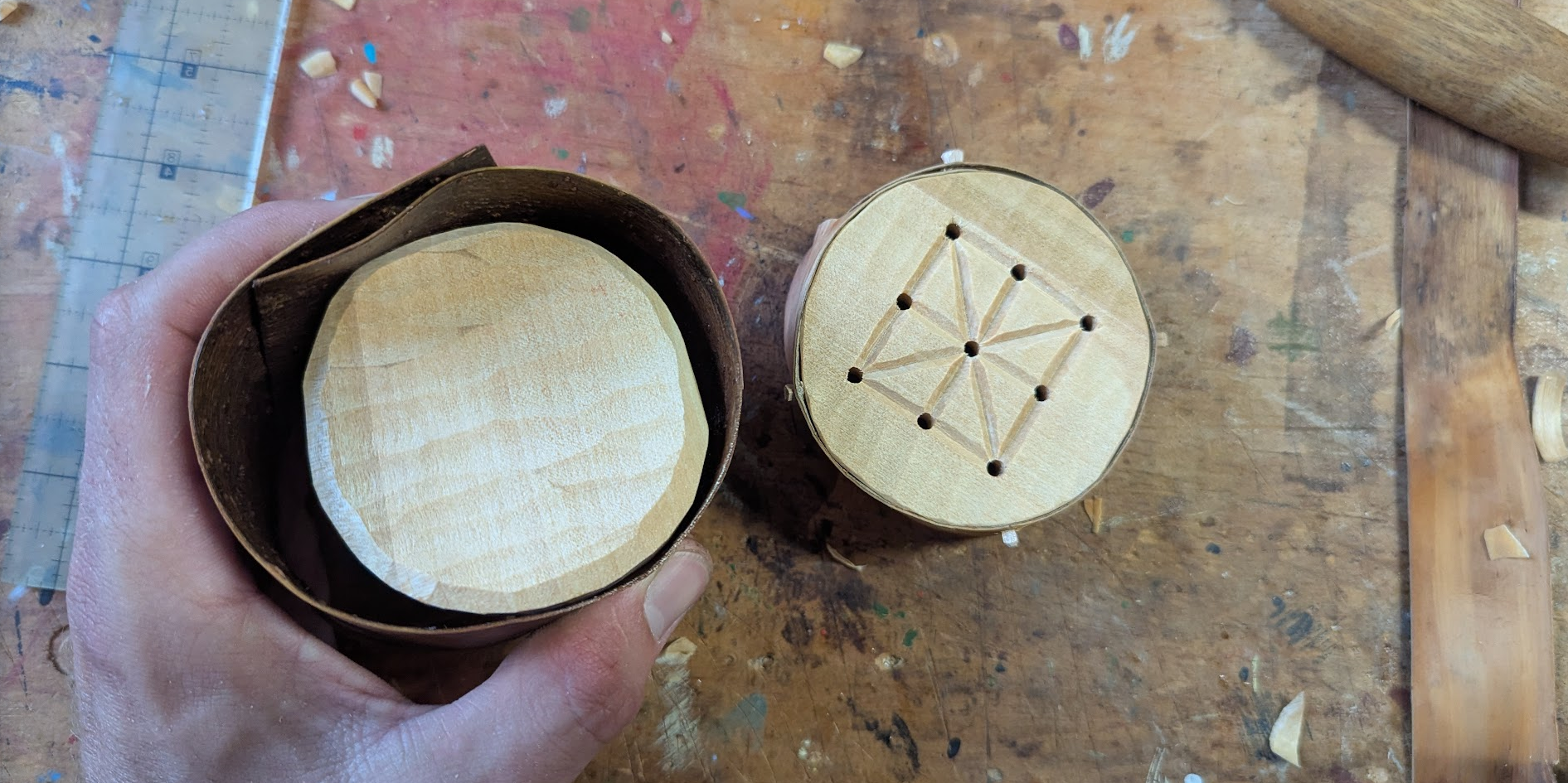 So, this bent-bark box thing. I'm trying to carve down the sides of this Three Man's Morris board into a smooth circle, so the bark can be bent evenly and snug to the surface. This is going to be the top of the box.
