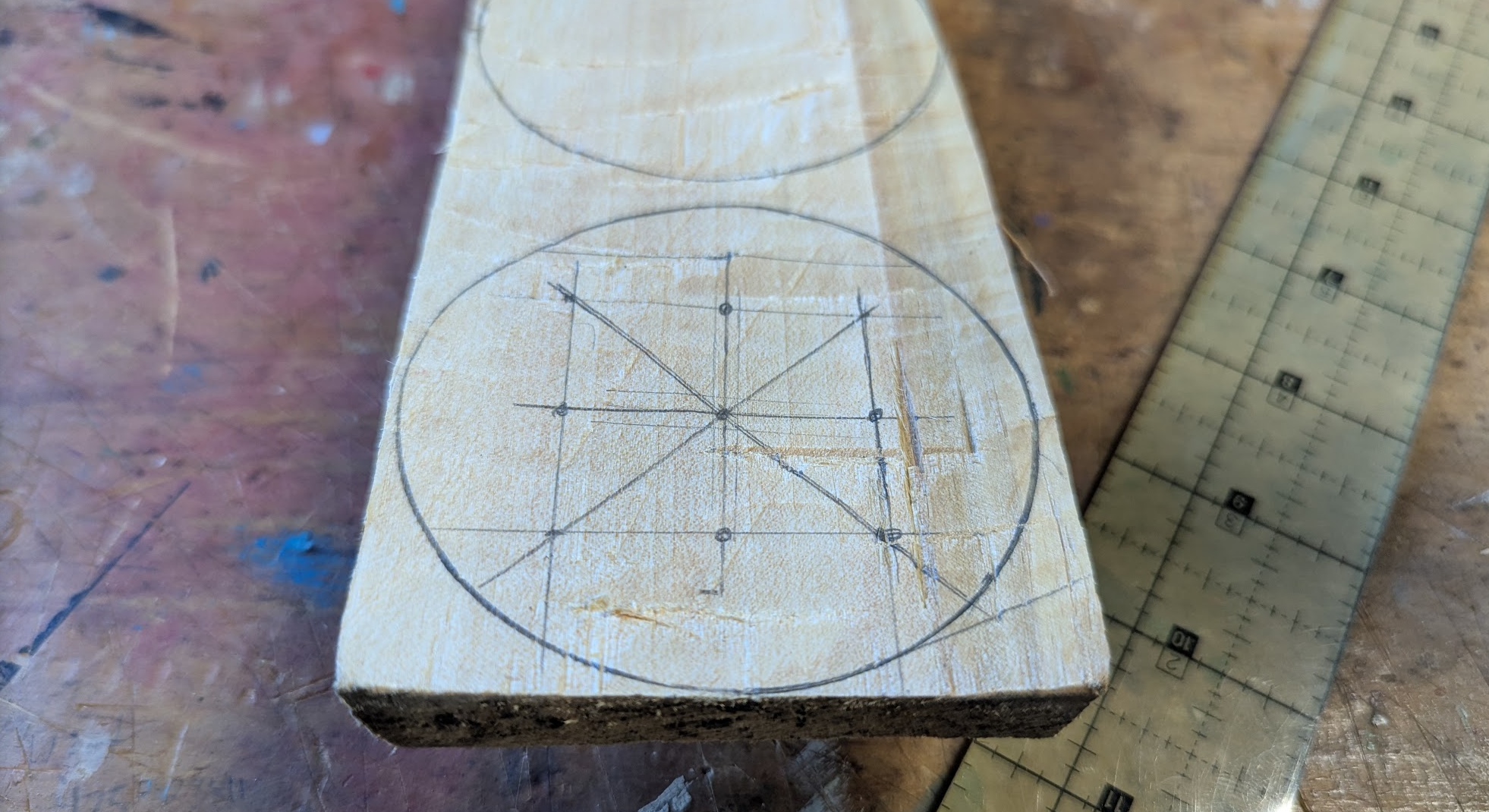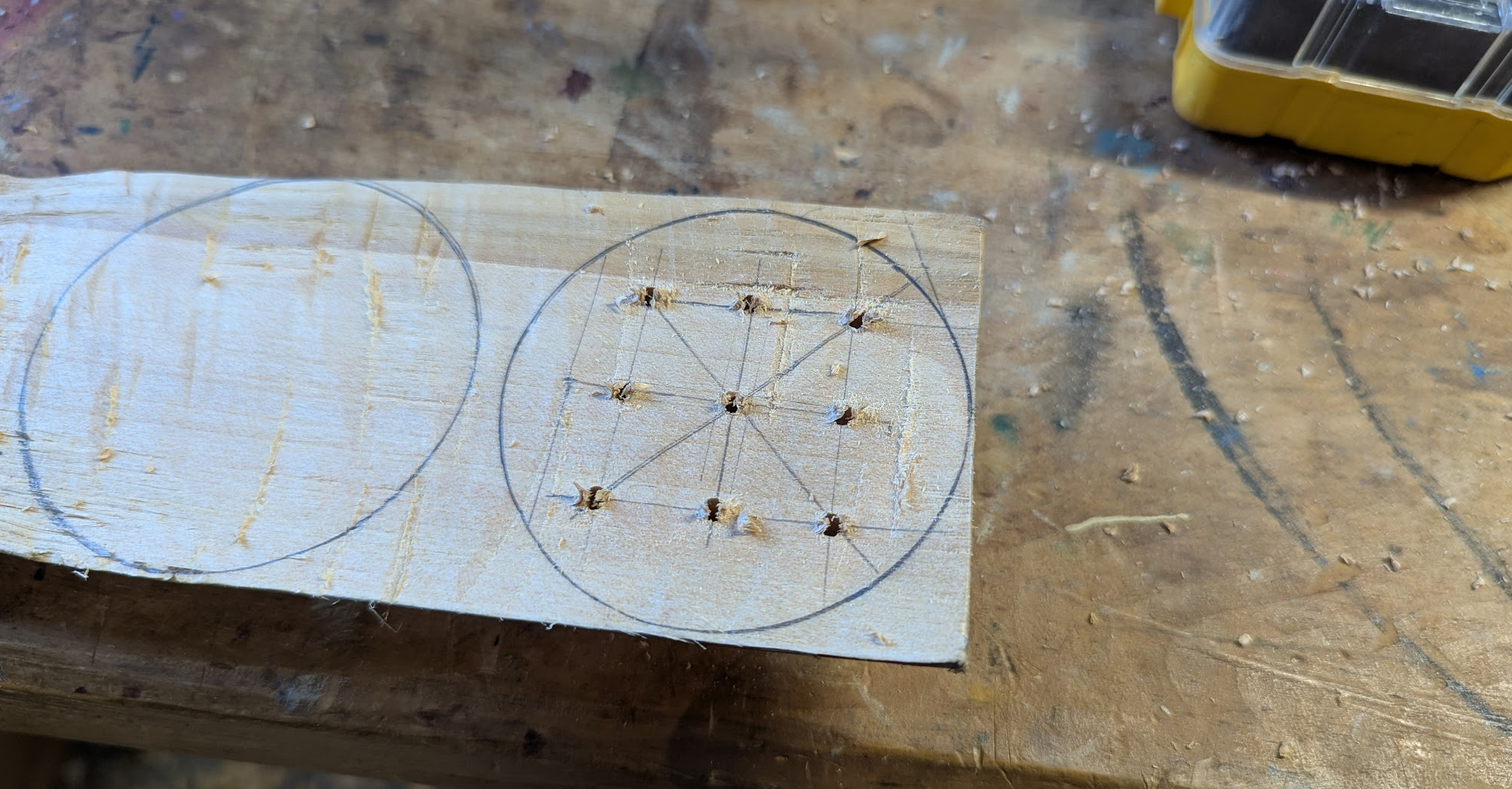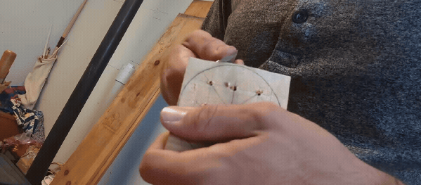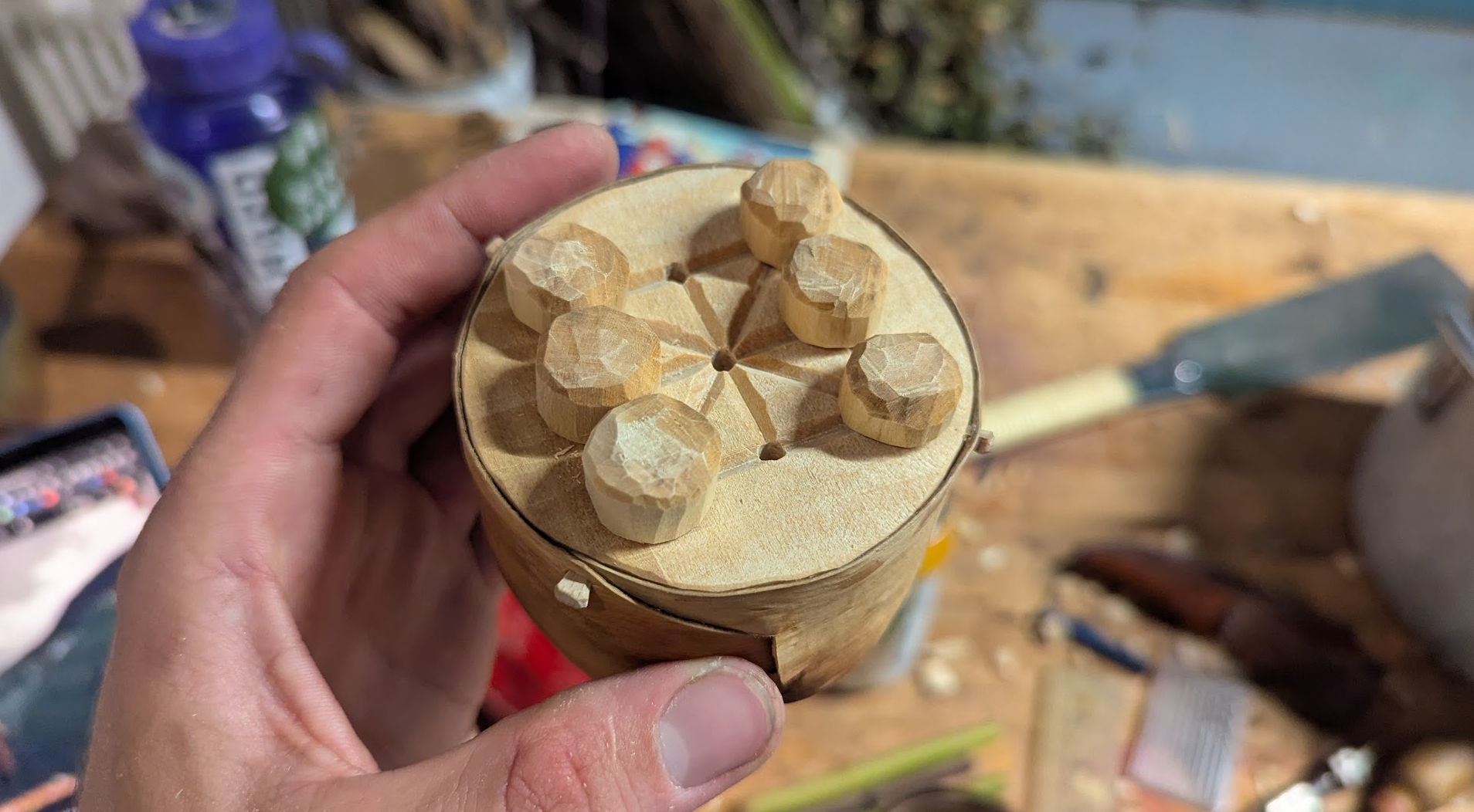So, this bent-bark box thing. I'm trying to carve down the sides of this Three Man's Morris board into a smooth circle, so the bark can be bent evenly and snug to the surface. This is going to be the top of the box.