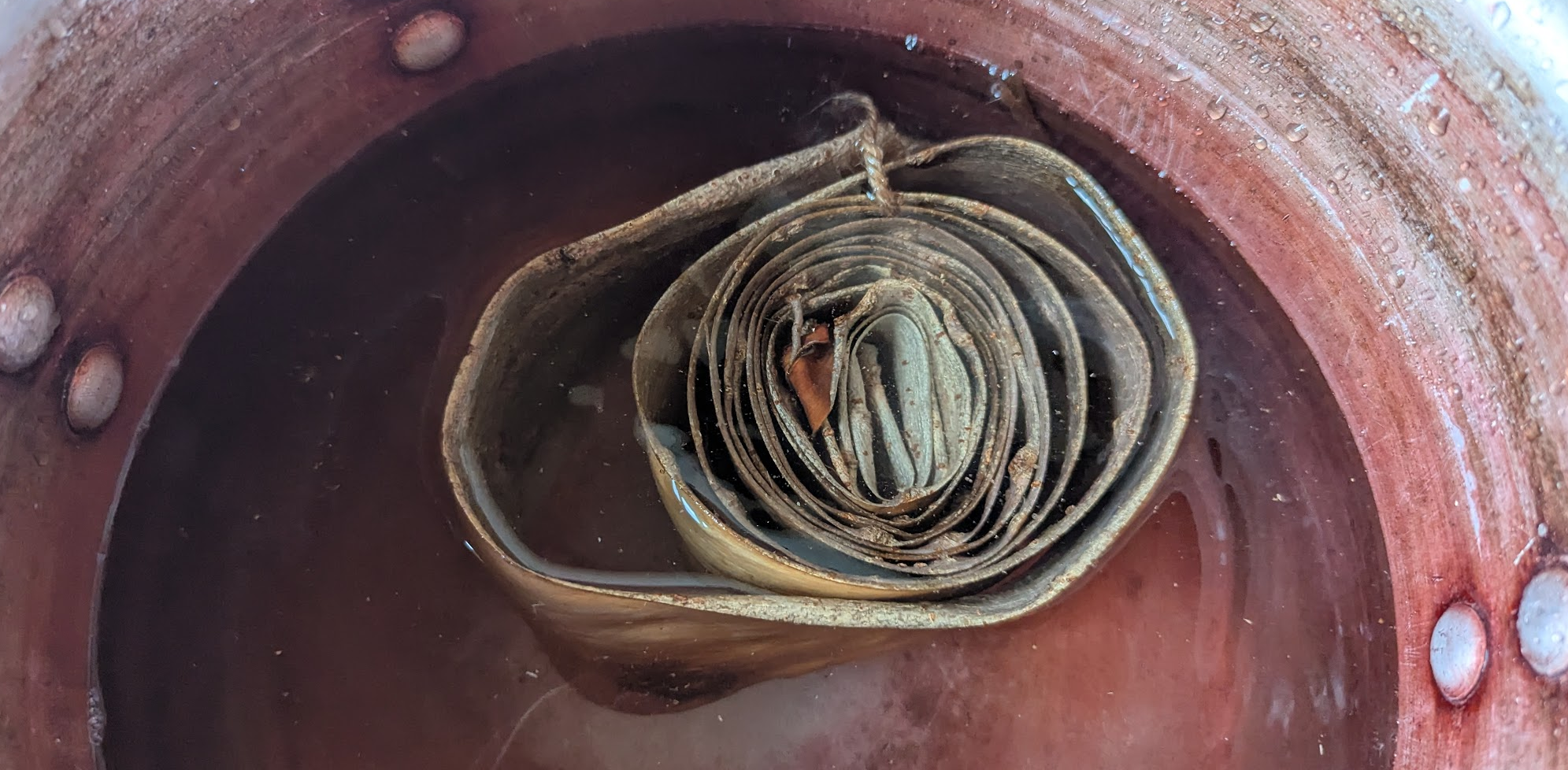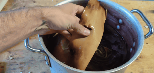 I'll let that soak for a few minutes while I research the game we will be making today. As you can see, this pot has been used for some natural dyestuffs recently! Madder root, perhaps?