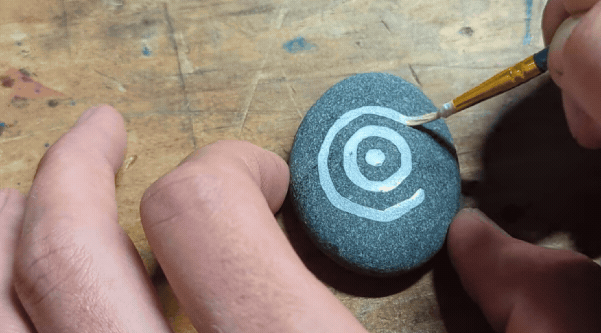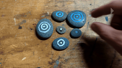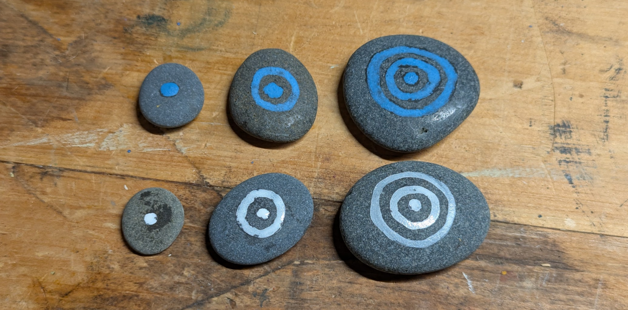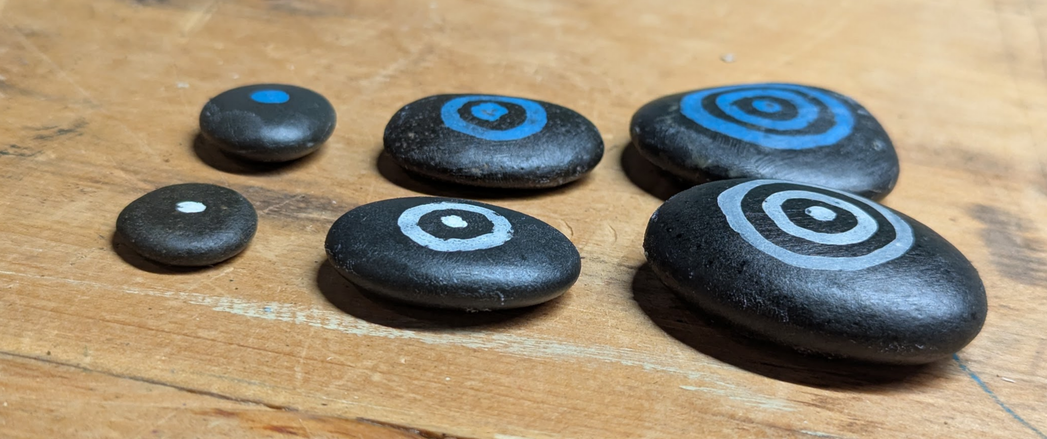 In my version, I'm using stones. The small stone has a dot, the medium stone has a dot and a ring, and the large stone has a dot with two rings.
