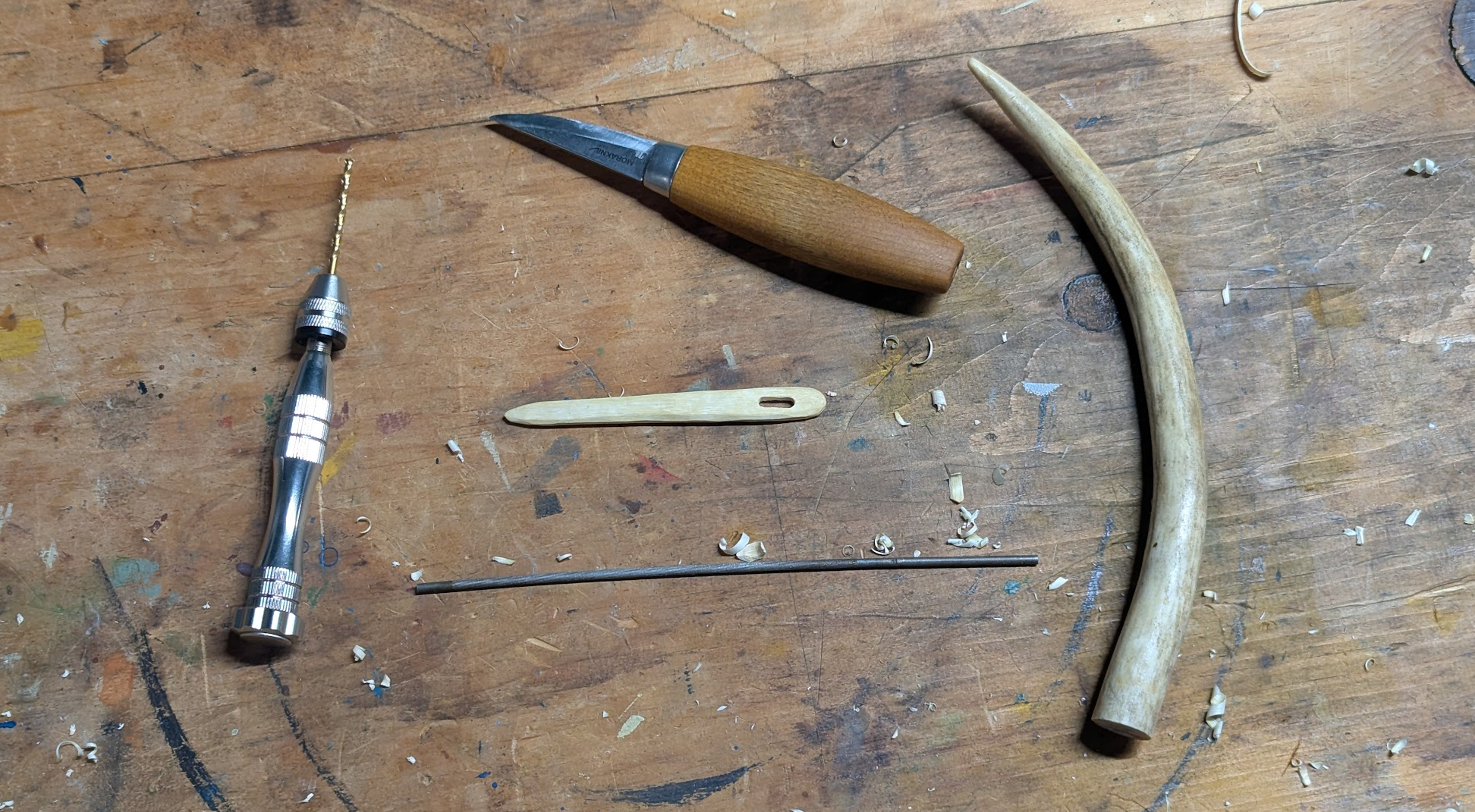 First, you need a needle. A nålbinding needle is best. Bigger than a darning needle. They can be quite long, but this one is a shortie.