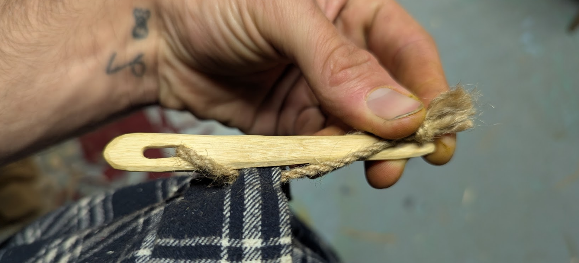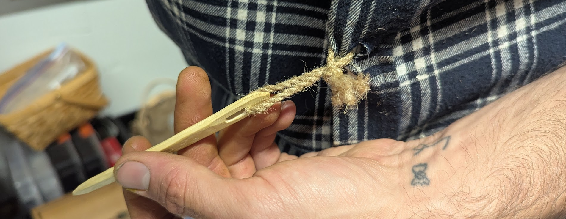 Then, you tie a wee string through the eye of the needle. It is critically important that the string is shorter than the needle, and does not stretch!
