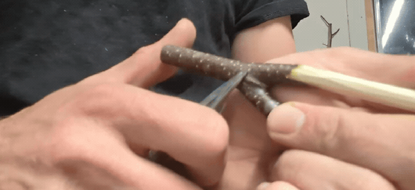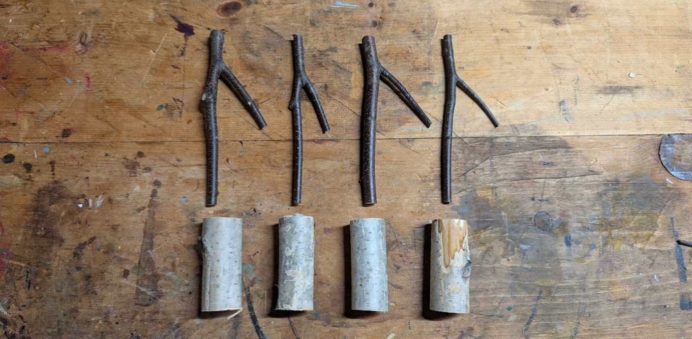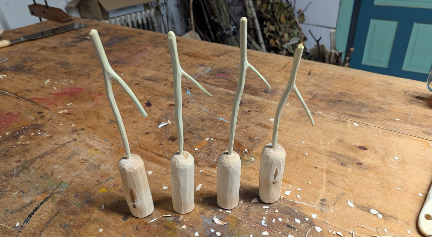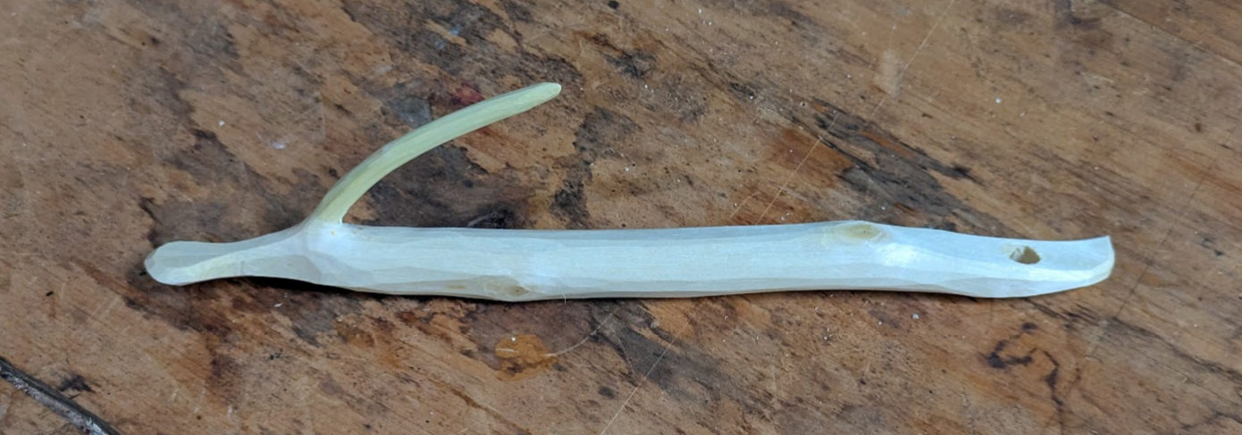 I'm wanting to make each of the four handles out of a heavy bottom and a forked top, as you can see. The bottoms, I hope, will add weight, while the forked tops will hold yarn in the same way that the spinning-stick does.