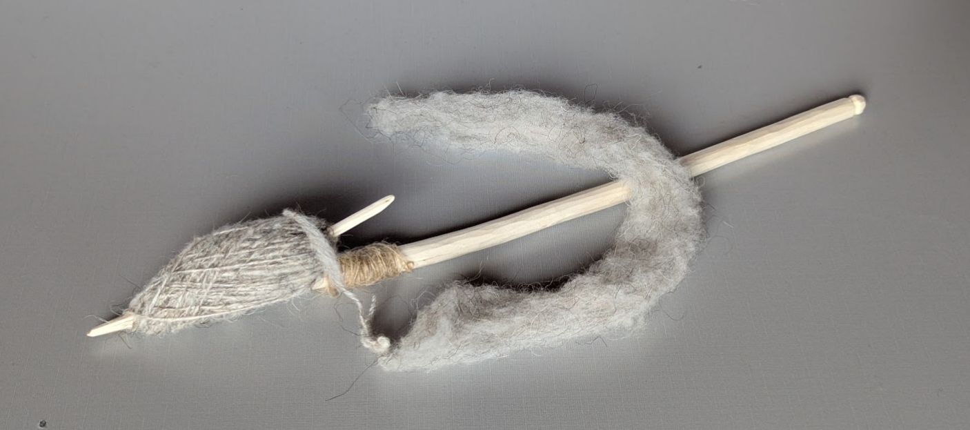 I'm not entirely pleased with my jugglebraid setup so far, and I suspect that there is an easier way to braid. I was inspired by the spinning-stick that my colleague Mathilde Lind and I made together (pictured above). It holds a big bundle of yarn without complaint and can wind or unwind cordage easily.