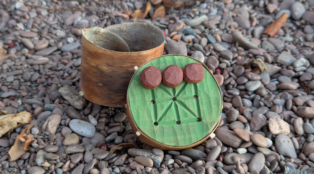 🪓 Craft: This is the game of Three Man's Morris, also known as Nine Holes, and is known to be at least a 4,000-year-old game. As you can see, I was experimenting with making bark canisters with Willow bark rather than Birch bark. I would say I was partially successful, and further research is needed.