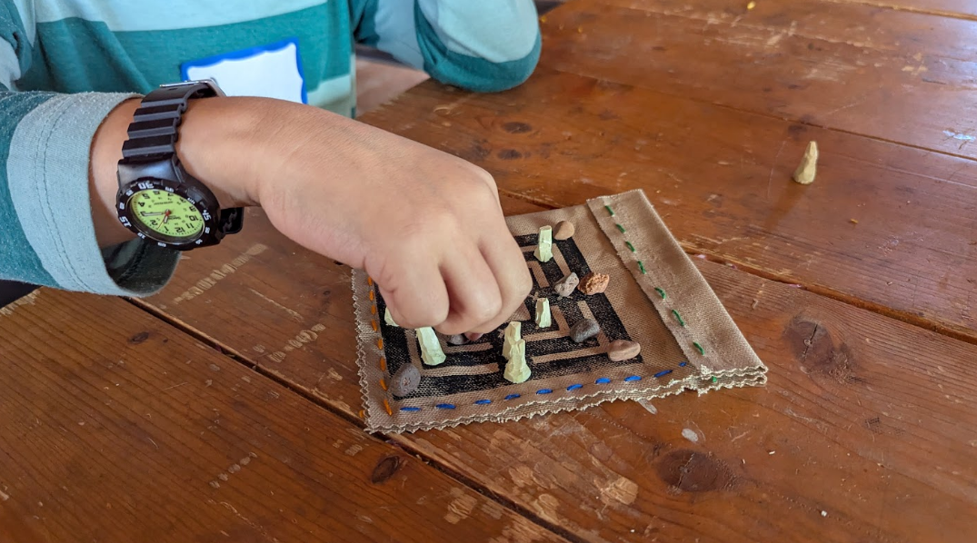 🪓 Craft: During Family Weekend at North House, Anna Sharratt and I taught a kid's class on making Nine Man's Morris boards. The students stamped, decorated, and sewed their game boards, carved their game pieces, and made rope drawstrings for their game board bags! It was lots of fun, and the kids created some very wonderful objects.