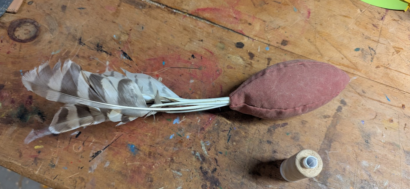🪓 Craft: This is a waxed canvas throwing football stuffed with Lauren Newby's sawdust and fletched with a spurt of wild-foraged feathers. The resemblance to a sweet potato was totally accidental.