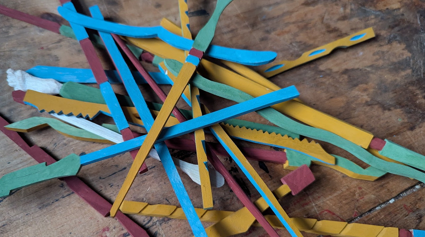 🪓 Craft: This is a set of Spellicans, which is an older word for the game of Pick-Up-Sticks. I carved them from splinters of Birch left over from other projects. Lauren Newby and Alex Blust carved a few sticks as well! They are colored with milk paint, and finished with tung oil.