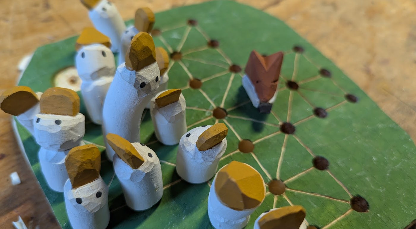 🪓 Craft: This is a venerable old game known as Fox and Geese. In the early American colonies, people would often make this game from old lumber or off-cuts of siding planks. There are more elaborate boards in the world, of course, but I am drawn to this game's expression as a common folk craft.